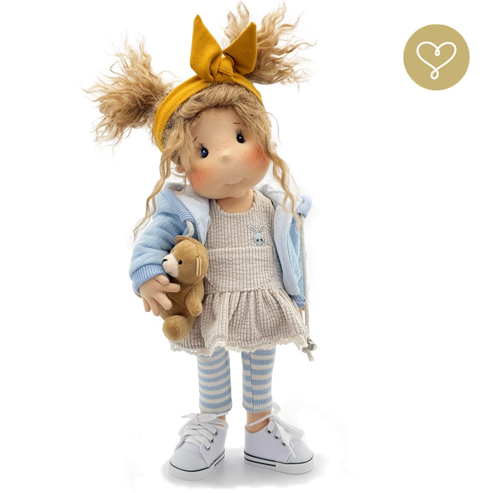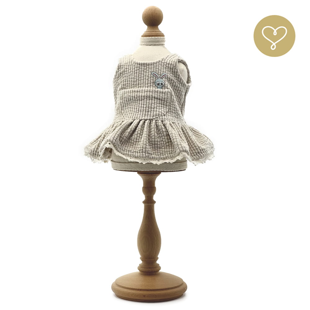 Hellbeiges Cordkleid mit Trägern. Mit zentraler Tasche und Applikation eines türkisfarbenen Häschens innen. Der Saum ist mit Baumwollspitze verziert.
